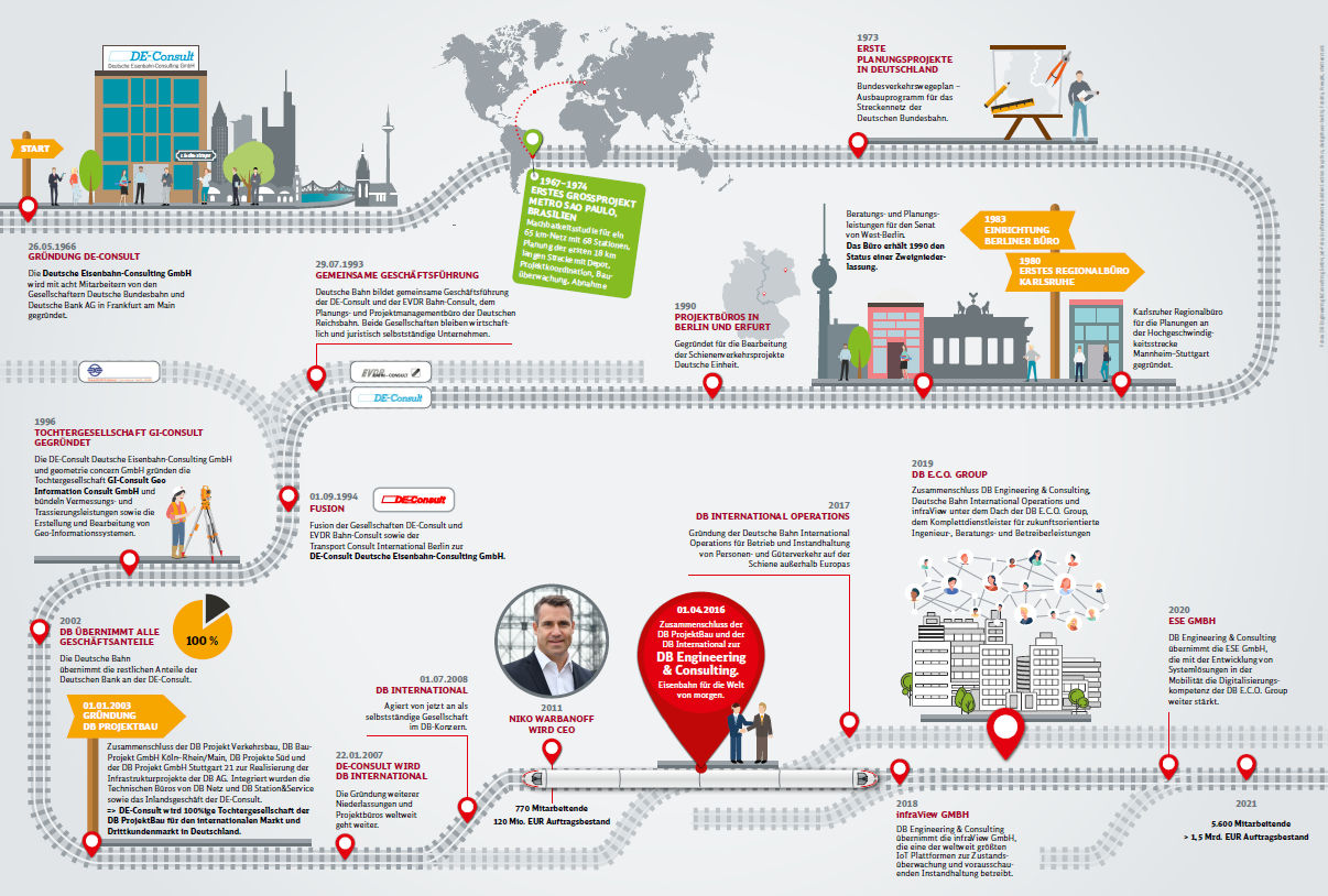 Unsere Verantwortung nehmen wir heute noch selbstbewusster wahr und treten mit gebündeltem Know-how auf. Denn als Teil der DB E.C.O Group verknüpfen wir gemeinsam mit unseren Töchtern, DB International Operations, infraView und ESE entlang der gesamten Wertschöpfungskette die Expertise des integrierten Bahnsystems mit digitalen Technologien und bringen das gefragte Know-how der DB zu ihren Kunden – innovativ, nachhaltig und weltweit.