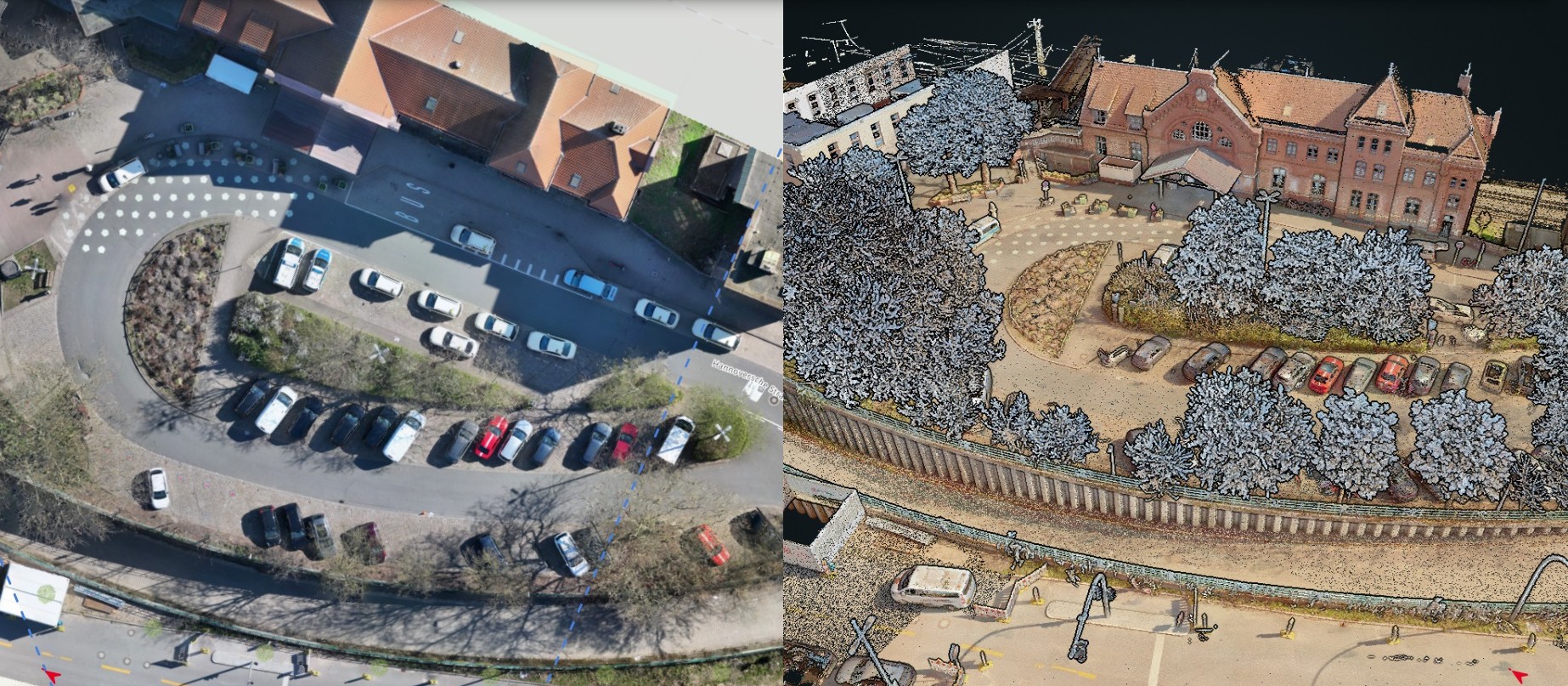 On behalf of DB InfraGo, DB E&C carried out a comprehensive 3D survey of the Hamburg-Harburg station forecourt. The aim was to create reliable and complete georeferenced pre-design information.